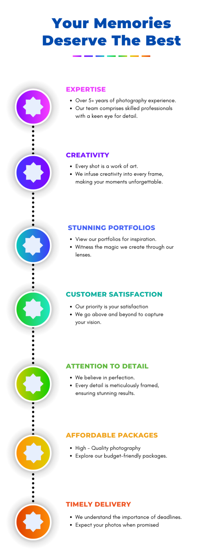 Our photographers are not satisfied with the ordinary; they strive to exceed expectations and deliver images that inspire. We stay updated with latest trends and techniques, infusing fresh creativity into every shoot.